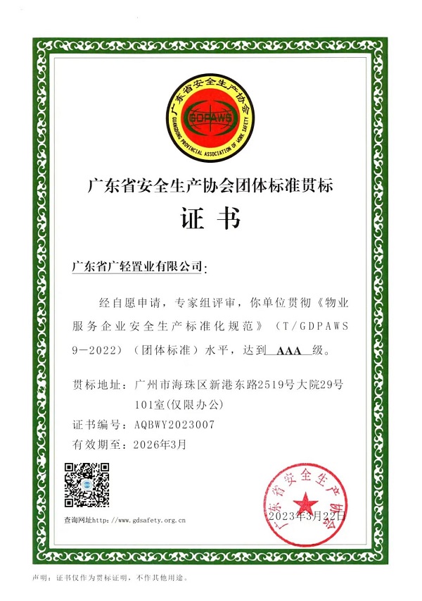集团动态 【企业动态】广轻置业获得省安全生产协会团体标准贯标证书